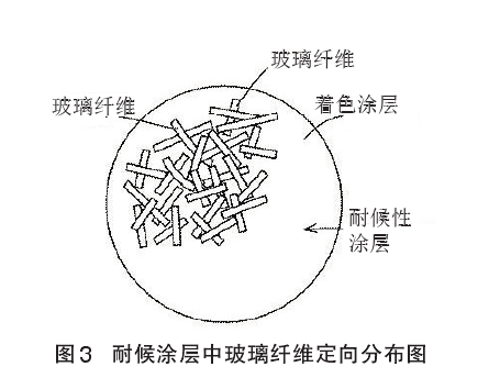 該高耐候性彩色水泥瓦制作流程是將以水泥為主要成分的坯料擠壓成坯,瓦體養(yǎng)護硬化,涂以涂料,修平整,形成底層涂膜層。為了防止瓦中堿分對上層涂膜層的侵蝕,可在底涂膜層上,涂以耐堿性涂料,形成耐堿涂膜層,然后涂以著色涂料,形成裝飾涂膜層,最后涂以耐候涂料,形成耐候涂膜層(見圖1和圖2)。著色涂層由含有所需著色顏料的水性丙烯酸涂料構成,其厚度約為100μm。耐候性涂層由與著色層相同的水性丙烯酸涂料與耐候性纖維(添加量為7%~12%)組成的涂料構成,其厚度約為 25μm。耐候性涂料用噴槍高壓噴涂在瓦著色裝飾涂層上。耐候性涂料涂覆在著色涂層上時,玻璃纖維以平躺姿態(tài),水平方向無序隨機定向分布(見圖 3)。對瓦涂以耐候性涂料后,為了固定玻璃纖維,約在100℃下充分干燥。